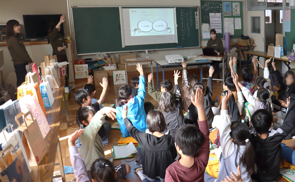 まずは、紙袋について学びます。紙袋にはどんな種類があるのか?どんな場面で使われているのか?クイズを交えながらの授業に、子どもたちは興味津々!元気いっぱいに答え、教室は笑顔と歓声でいっぱいになりました。