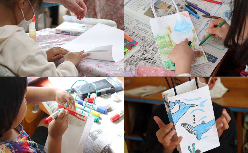 そして次の時間はいよいよオリジナルデザイン!子どもたちは思いおもいに個性あふれる絵柄を描き、世界にひとつだけの紙袋が完成しました。完成した瞬間、教室は歓声と笑顔でいっぱいになり、紙袋作りを通して得た達成感と楽しさが子どもたちの心にしっかり刻まれました。